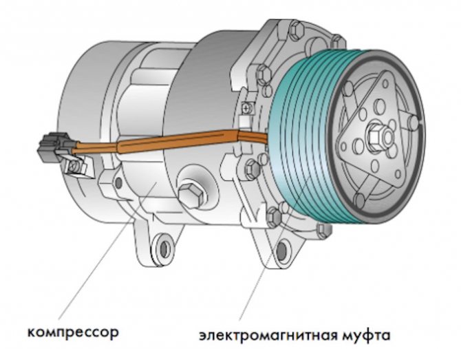 При включении кондиционера питание подаётся на электромагнитную муфту, которая вступает в зацепление с валом компресса, приводя его в движение. Выключение системы кондиционирования выполняет обратную задачу – муфта выходит из зацепления, шкив продолжает вращаться, но компрессор при этом не работает.