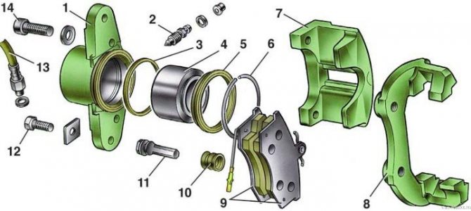 1 – колесный цилиндр; 2 – штуцер для прокачки привода тормоза; 3 – уплотнительное кольцо; 4 – поршень; 5 – защитный колпачок; 6 – стопорное кольцо; 7 – суппорт; 8 – направляющая колодок; 9 – тормозные колодки; 10 – защитный чехол; 11 – направляющий палец; 12 – болт крепления направляющего пальца; 13 – тормозной шланг; 14 – болт крепления цилиндра к суппорту.