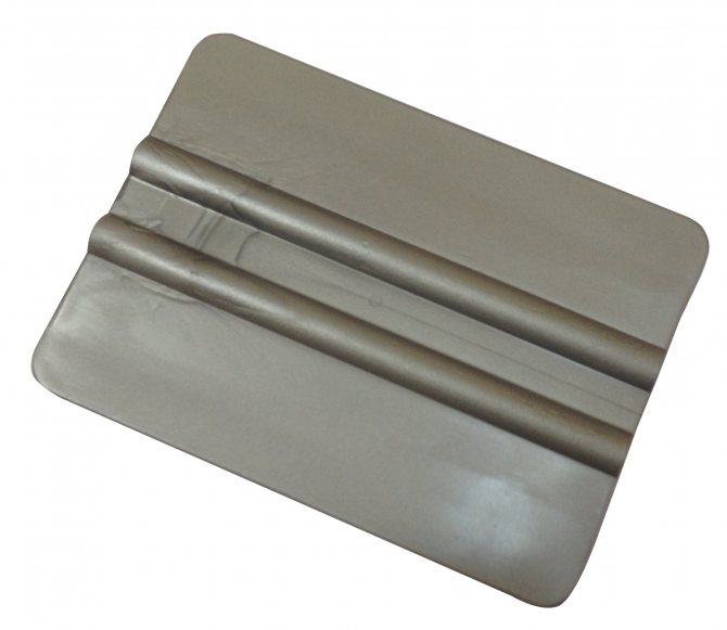 - Осталось приложить тонировочную пленку к заготовке, сделать необходимые корректировки и начать разглаживание материала при помощи выгонки. Первый проход от центра к краям делается без нажима. При втором и третьем разглаживании выгонка сильно прижимается к заготовке. При этом необходимо смачивать пленку для хорошего скольжения.