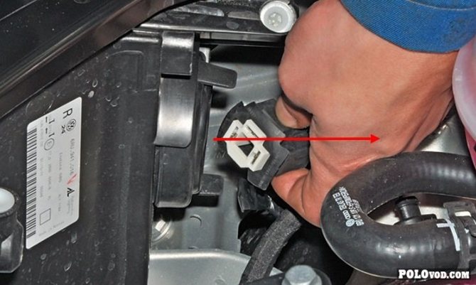 - Чтобы достать лампу ближнего света на автомобиле Фольксваген Поло, нужно повернуть ручку цоколя и освободить «лапки», которые держат деталь, из пазов.