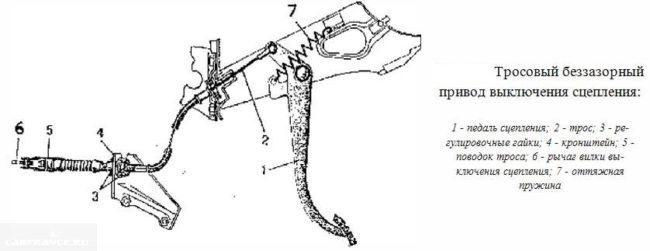 Механизм служит для передачи усилия от педали к вилке выключения, которая, в свою очередь, отводит фрикционный диск от маховика. Использование тросовой передачи позволяет избежать таких крупных проблем, как протечка жидкости и периодическое удаление воздуха из системы управления муфтой. В этой цепи самое слабое звено – трос, качество которого временами оставляет желать лучшего. Поэтому замена троса на Samara – довольно частое явление.