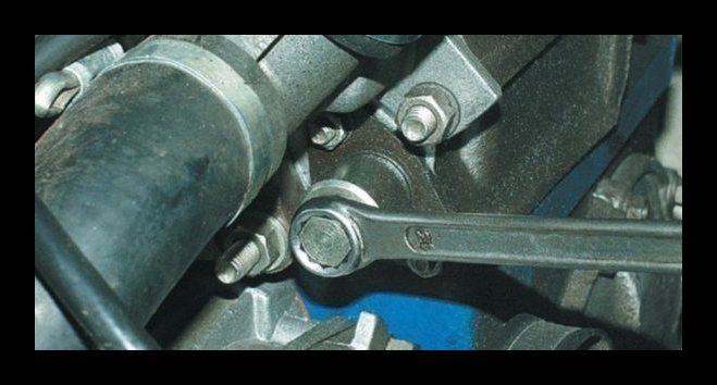- Спуститесь в канаву и демонтируйте защиту поддона картера. Сразу же открутите 3 передних болта, соединяющих поддон с торцевой крышкой, ослабьте гайку на нижнем креплении генератора.