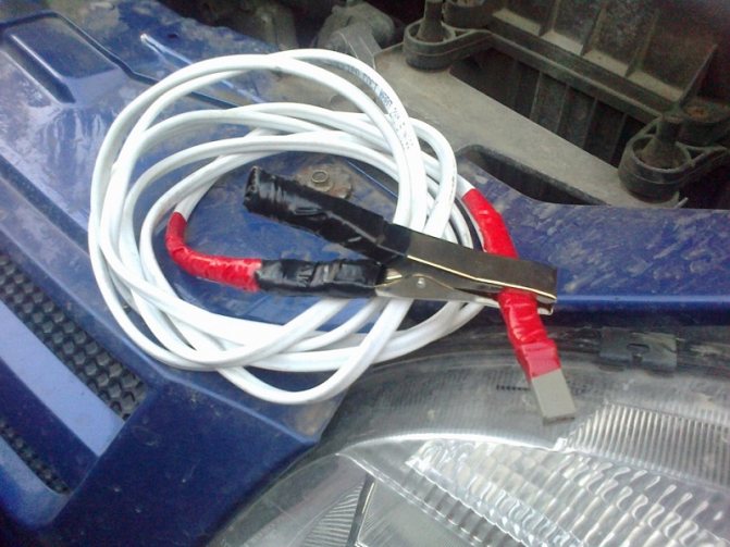 Отрезок медного кабеля, клеммы типа «крокодил» и плоский штекер, — вот и всё, что нужно для прямого соединения стартера с АКБ. Из этих трёх компонентов собирается переноска, которая даст возможность завести двигатель. Интегрировать самодельное устройство нужно с силовым кабелем, идущим на стартер. Он имеет разъём, куда и необходимо вдеть провод.