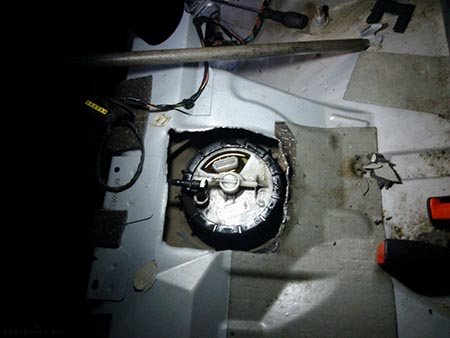 Сгоревший бензонасос вы найдете в бензобаке. Поднимите задний диван сидений. Под ней как раз и находится насос. Но сложность заключается в том, что конструкторы не придумали какой-либо крышки на болтах. Поэтому Вам будет необходимо вырезать ножницами по металлу отверстие диаметром примерно 23 – 25 см. Теперь вы можете видеть сам бензонасос. Снимите трубки топливопроводов. Будьте осторожны, в них еще находится бензин, который может немного забрызгать салон машины и вашу одежду. Если не хотите чтобы бензин расплескался, снимите топливопровода и запустите двигатель. Через несколько минут ДВС заглохнет, а бензина в трубках не останется. Затем вам надо снять уплотнительное кольцо, которое держит бензонасос. Отверткой открутите нужные винты и извлеките насос из бензобака.