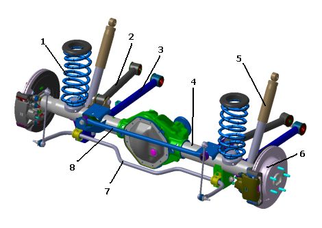 Рис. 1 — витая пружина; 2 — верхний продольный рычаг; 3 — нижний продольный рычаг; 4 — балка моста; 5 — амортизатор; 6 — ступица колеса; 7 — стабилизатор поперечной устойчивости; 8 — поперечный рычаг (тяга Панара).