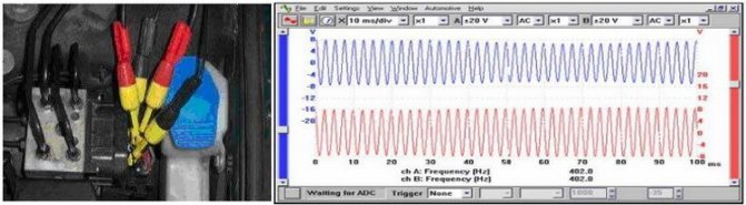 В данном случае принцип проверки исправности датчика АБС будет основываться на сравнительном анализе полученных результатов. Итак, вся процедура на начальном этапе аналогична той, что проводилась ранее с мультиметром, только вместо тестера к выводам датчика следует подключить осциллограф.
