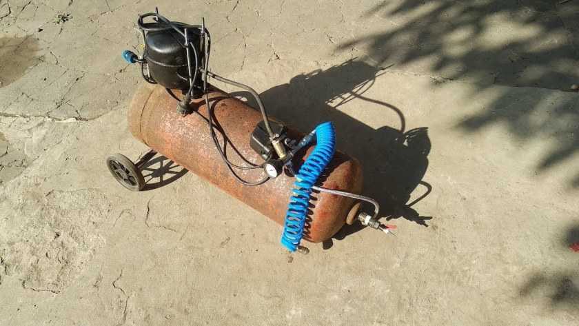 Если мощности самодельного компрессора вам будет в дальнейшем не хватать, всегда можно усовершенствовать конструкцию, заменив, к примеру, ресивер из огнетушителя на баллон от пропан-бутана или вообще на газгольдер б/у.