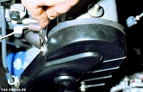 - Отвернув три болта, необходимо снять защитную крышку ГРМ.
