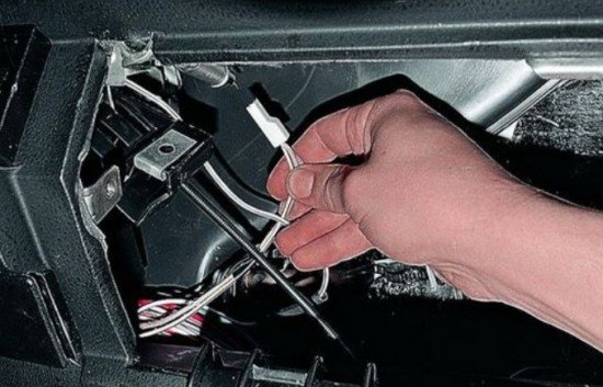 - Первоначально отсоединяются фишки питания кнопки печки. При этом обязательно запоминать расположение проводов. Рекомендуется делать фото, чтобы не перепутать, когда будет выполняться сборка.