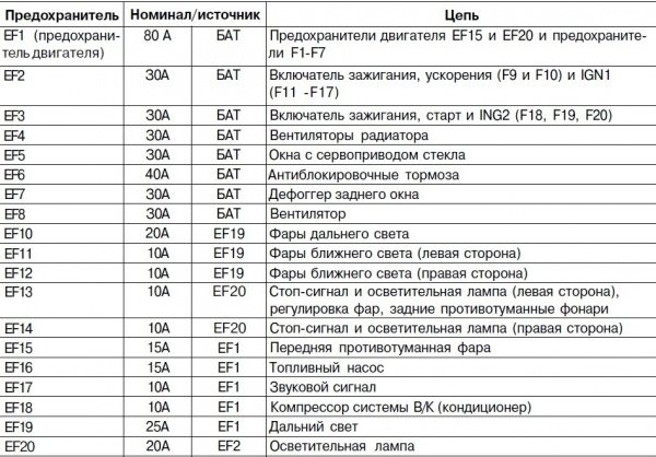 - Цепи предохранителей EF15–EF20 и предохранителей салона F1–F7;