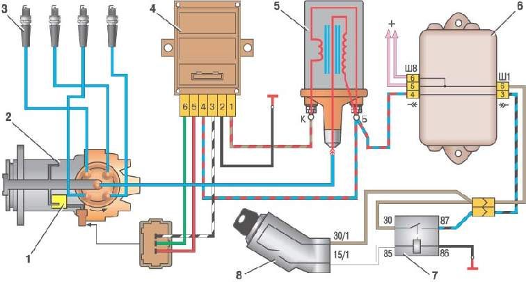 1 — бесконтактный датчик; 2 — датчик-распределитель зажигания; 3 — свечи зажигания; 4 — коммутатор; 5 — катушка зажигания; 6 — монтажный блок; 7 — реле зажигания; 8 — замок зажигания