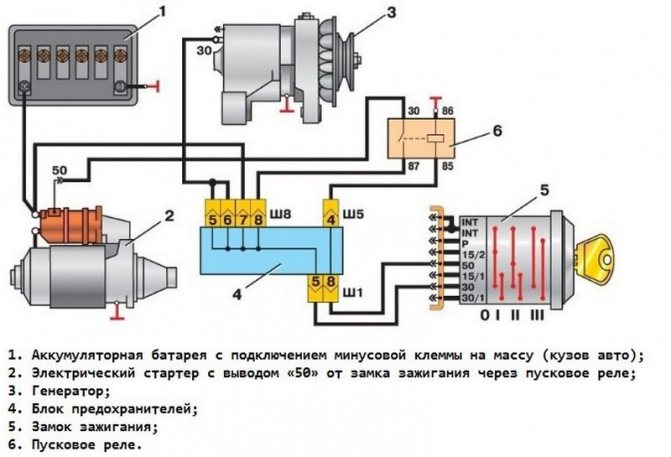 - «50» – вывод, отвечающий за подачу тока на стартер (красный или пурпурный провод);
