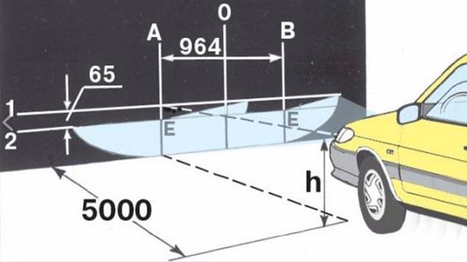 - А — расстояние от поверхности площадки на которой установлен автомобиль до ламп ближнего света фар.
