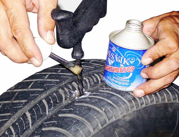 - В прокол или боковой порез шины инструмент должен входить с усилием. Вынимать его нужно также, вращая в том же направлении. Ввод и вывод повторить несколько раз, добиваясь, чтобы клей покрыл внутреннюю поверхность пореза или прокола.