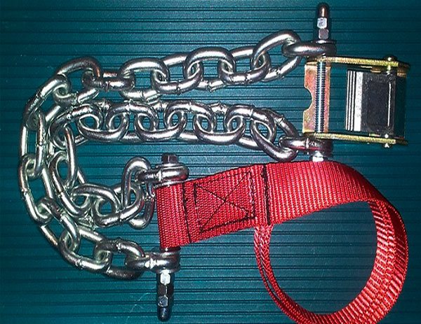 Портативные устройства от пробуксовки представляют собой 2 короткие цепи с крупными звеньями, соединенные между собой с двух краев болтами. Анкеры служат креплением для ремней, с помощью которых браслет надевается на колесо.