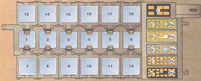 В состав основного блока входит двадцать одно (у дизельных моделей 22) устройство, что понятно из таблиц. Они универсальны для всех моделей Ауди-80, но в зависимости от комплектации расположение может отличаться. Перед ремонтом следует свериться с расположением предохранителей на оборотной стороне защитной крышки блока.
