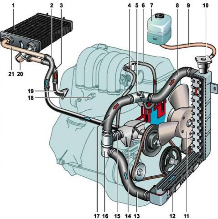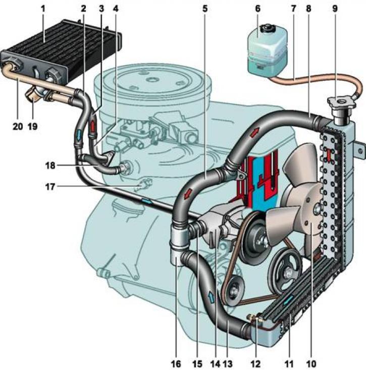 — радиатор отопителя; 2 — шланг отвода охлаждающей жидкости от радиатора отопителя; 3 — шланг подвода охлаждающей жидкости к крану отопителя; 4 — трубка отвода охлаждающей жидкости от головки блока цилиндров; 5 — перепускной шланг; 6 — расширительный бачок; 7 — соединительный шланг расширительного бачка; 8 — шланг подвода охлаждающей жидкости к радиатору; 9 — пробка радиатора; 10 — электровентилятор радиатора; 11 — радиатор системы охлаждения; 12 — датчик включения электровентилятора; 13 — шланг отвода охлаждающей жидкости от радиатора; 14 — насос охлаждающей жидкости; 15 — шланг подвода охлаждающей жидкости к насосу; 16 — термостат; 17 — датчик указателя температуры охлаждающей жидкости; 18 — шланг отвода охлаждающей жидкости от впускного трубопровода; 19 — кран отопителя; 20 — трубка отвода охлаждающей жидкости от радиатора отопителя