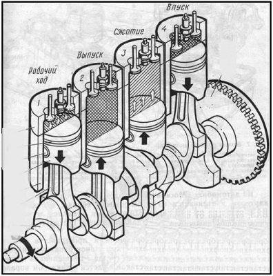 - Впуск ― выпускной клапан закрыт, впускной открыт, поршень движется вниз, производится всасывание воздушно-топливной смеси.