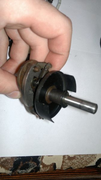 далее доработал вал, заменил грузики опережения угла зажигания на девятошные.Они меньше и легче чем у оки, на фото показаны окушинские грузики!И соответственно пружинки тоже заменил.Шторка осталась штатная окушенская я её не трогал.если делать из девятошного вала то шторку надо тоже доработать отпилив две противоположные.чтобы была как на фото:
