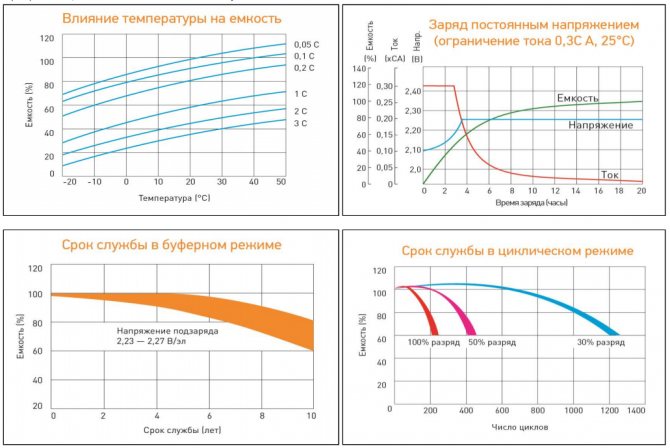 являются количество циклов заряд-разряд и срок службы при постоянном буферном подзаряде до снижения ёмкости на 20-40 процентов. Дополнительно в информационном листке (даташите) к аккумуляторной батарее производители обычно предоставляют таблицы и графики ёмкости при разных токах и мощности разряда до разных напряжений с учётом температуры.