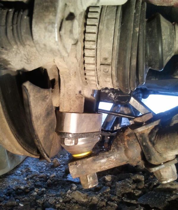 Чтобы окончательно убедиться в том, что деталь вышла из строя, придётся разобрать подвеску, отсоединив шаровую опору от поворотной цапфы.