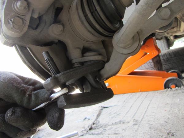 После этого вставляем наш съемник под резинку (пыльник) опоры и откручиваем болт съемника до тех пор, пока от действия рычага приспособления, палец не выскочит из своего посадочного места: